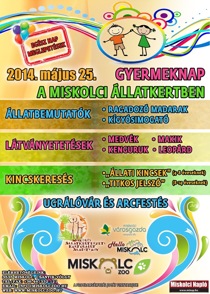 2014. május 25-én, Gyermeknapon a Miskolci Állatkertbe látogatókat, az összegyűlt gyereksereget egész napos szórakoztató gyermeknapi programok várják reggeltől estig a Miskolci Állatkertészeti Kultúráért Alapítvány támogatásával.
