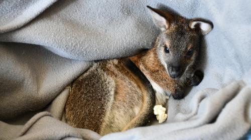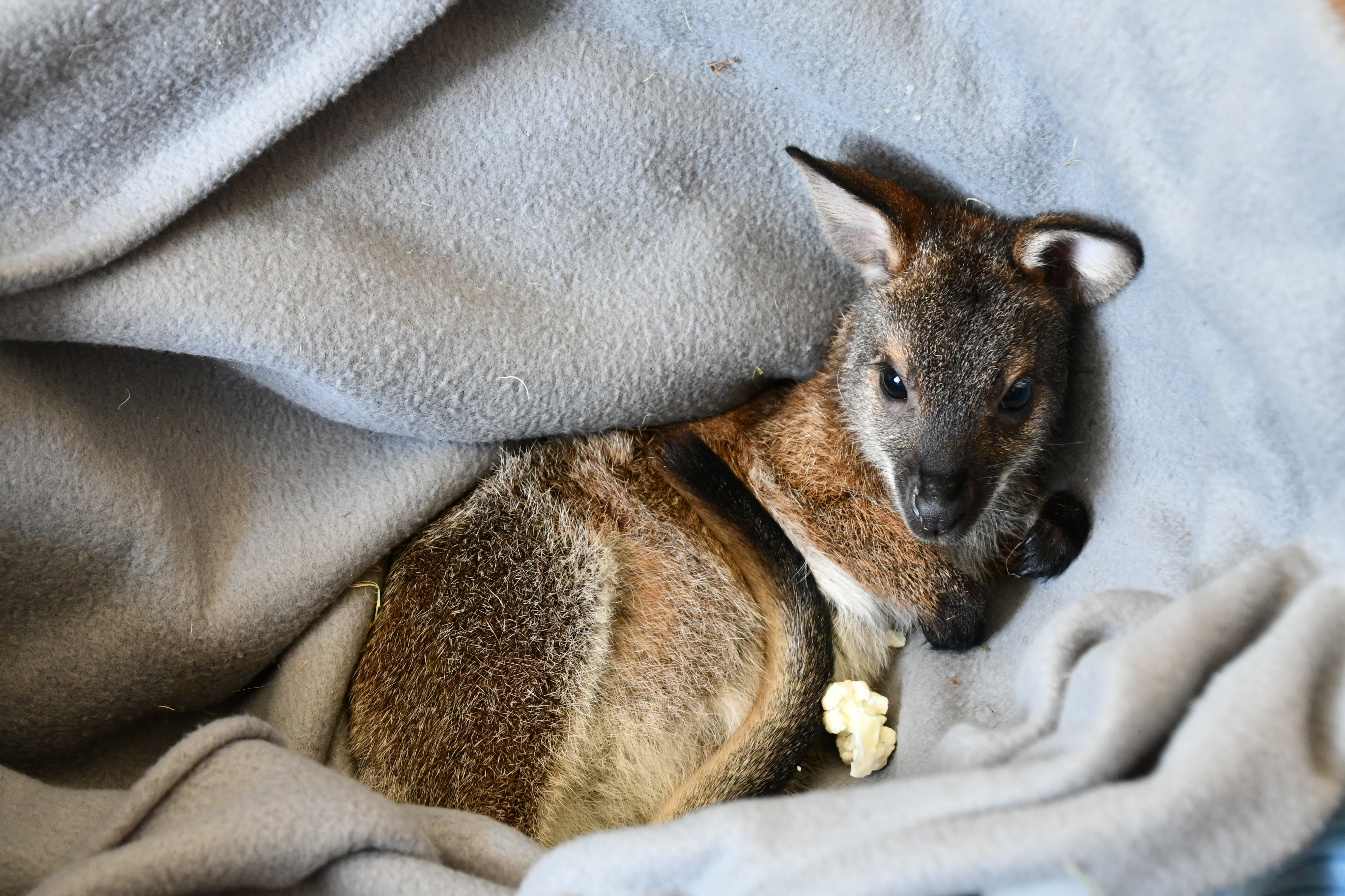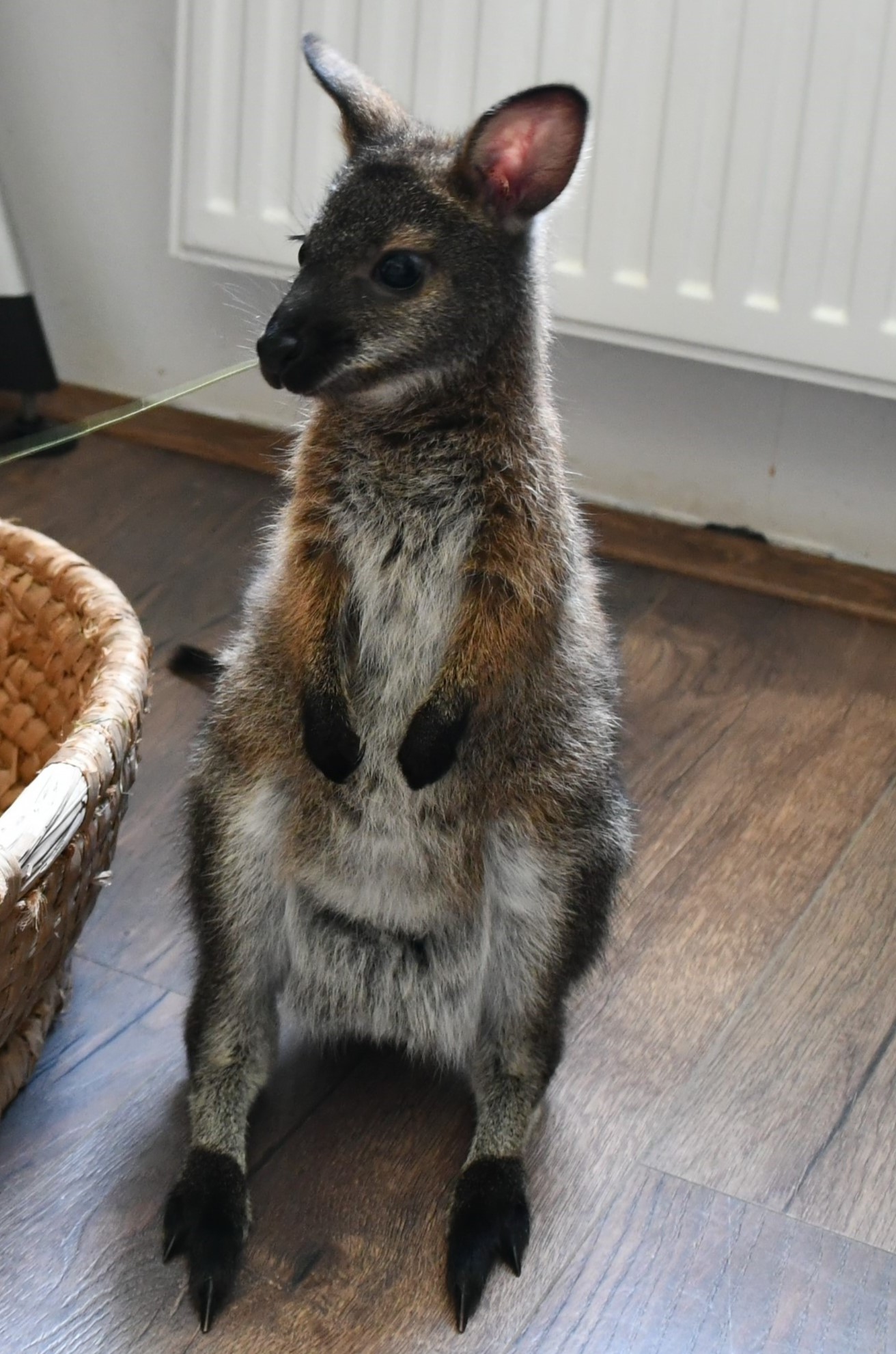 Miután váratlanul elpusztult egyik nőstény Bennett-kengurunk, az erszényében cseperedő kölyköt kolléganőnk vette magához. A kicsi már 2 kg-os, bár szépen növekszik a „műerszényben” és már szilárd táplálékot is kóstolgat, még hosszú hetekig szüksége lesz a gondoskodásra.