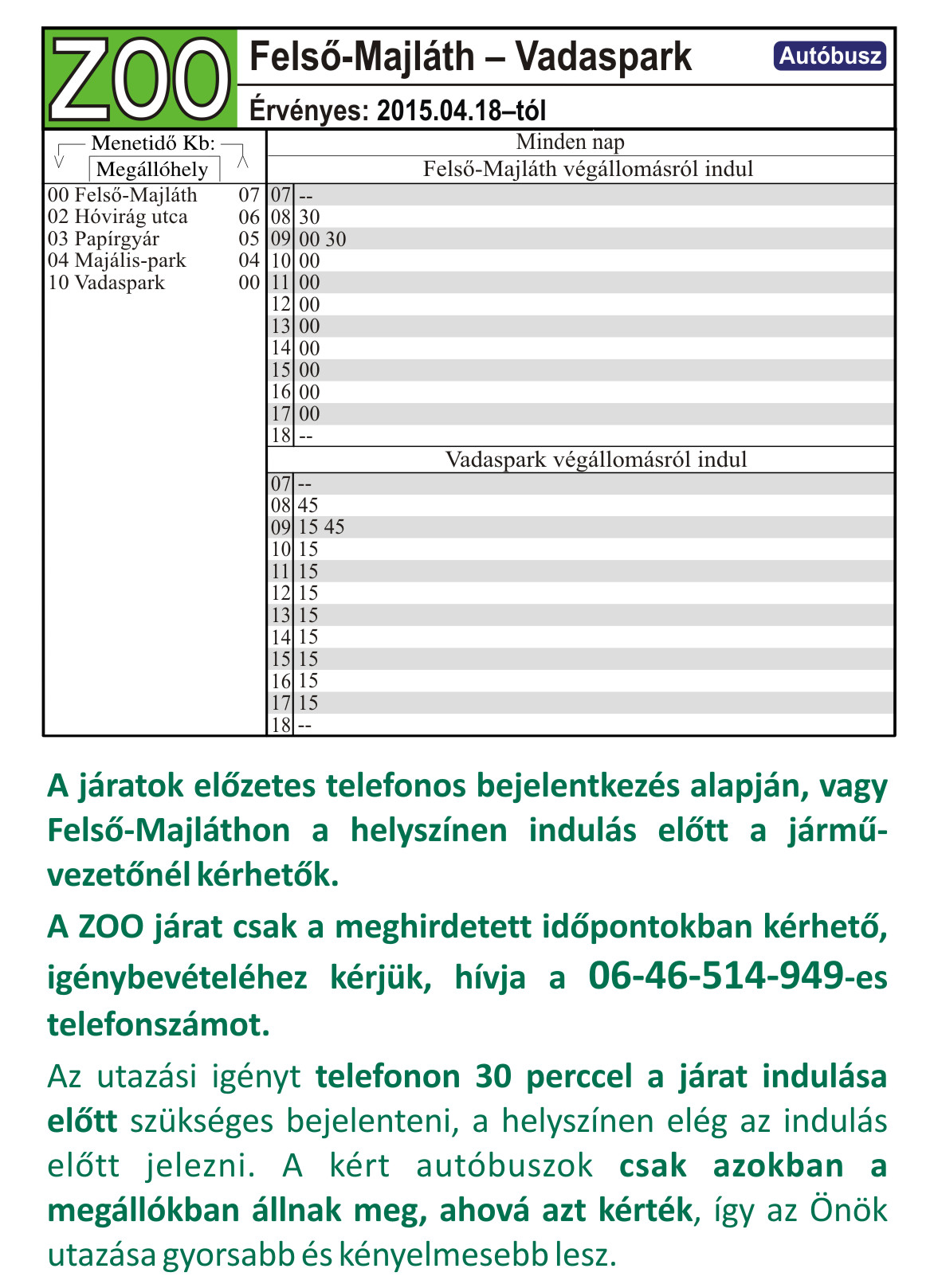 06-46-514-949-es telefonszámon. Felső-Majláth végállomáson a helyszínen is igényelhető a ZOO járat az indulás előtt.